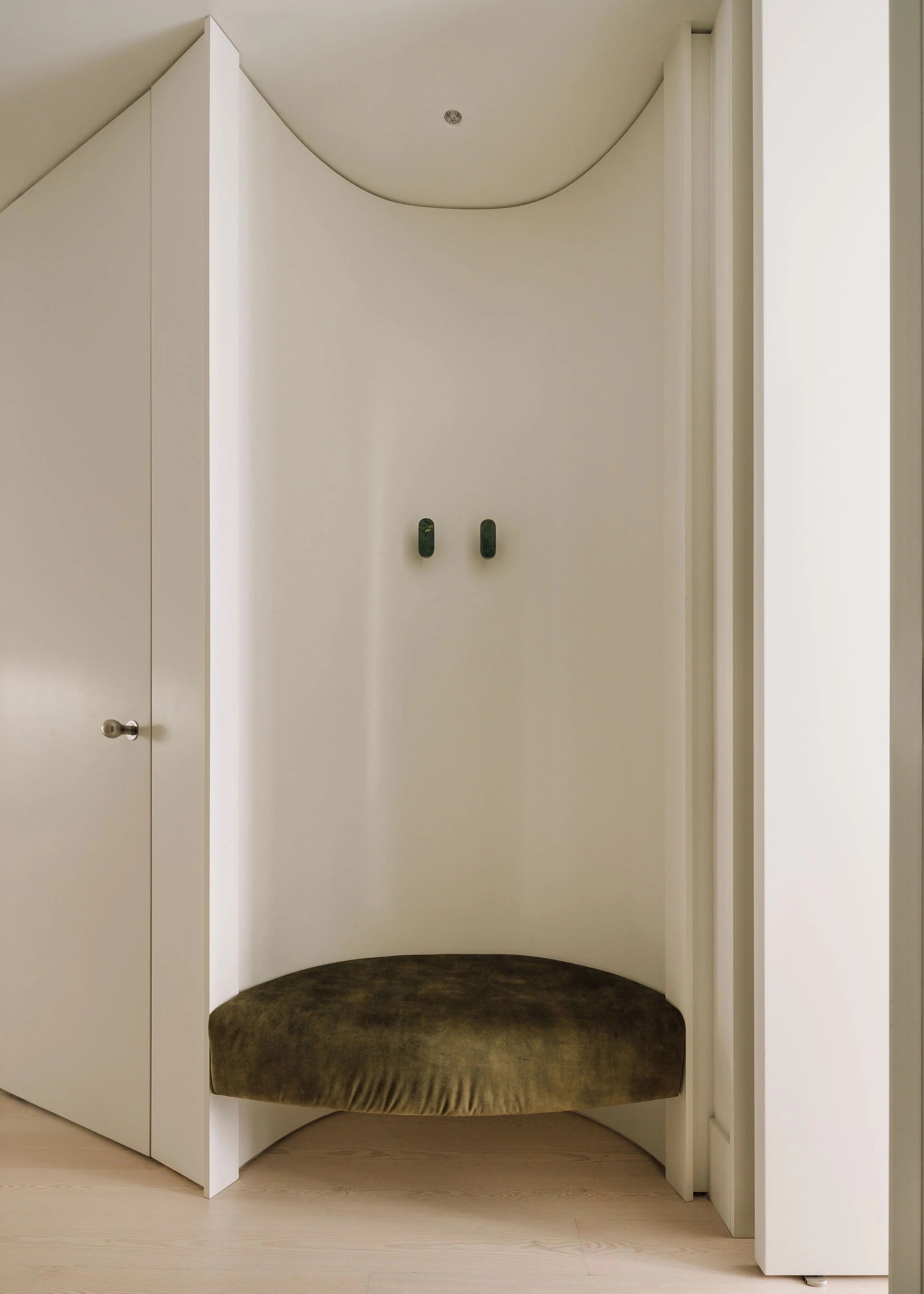 Soft, restrained interiors are defined by warm neutrals, curved forms, and custom millwork that create a calm, tactile living experience rooted in simplicity and precision