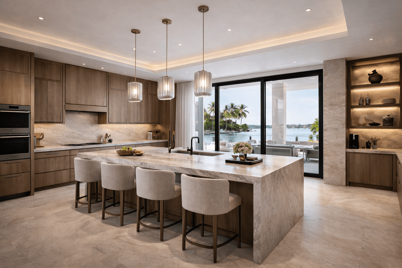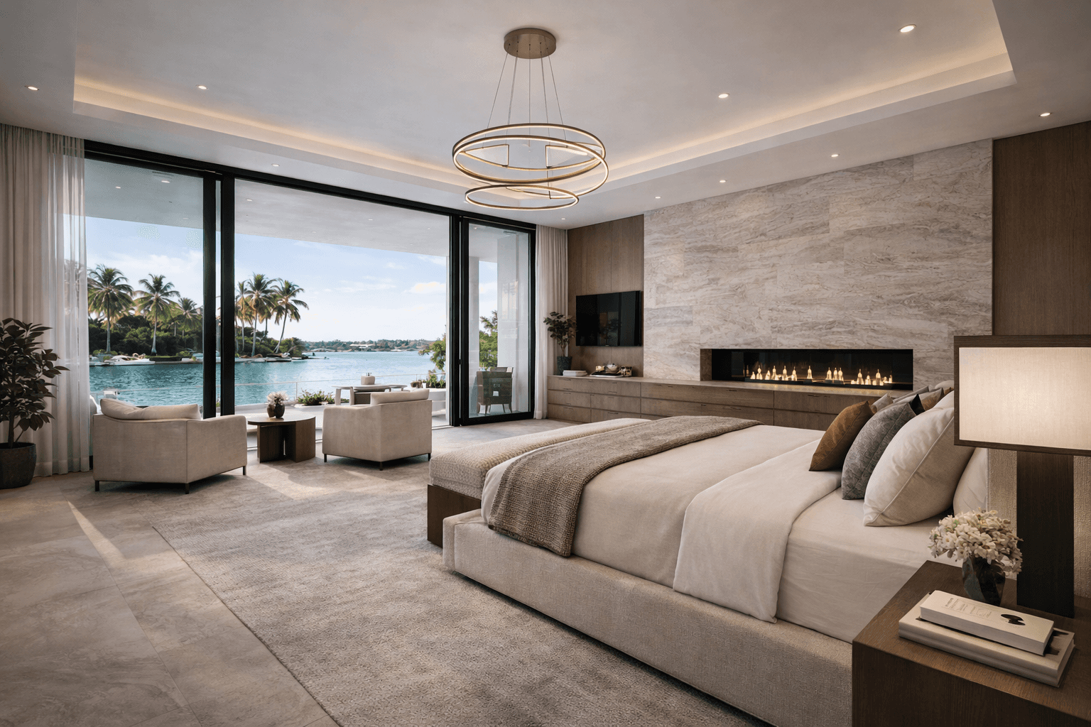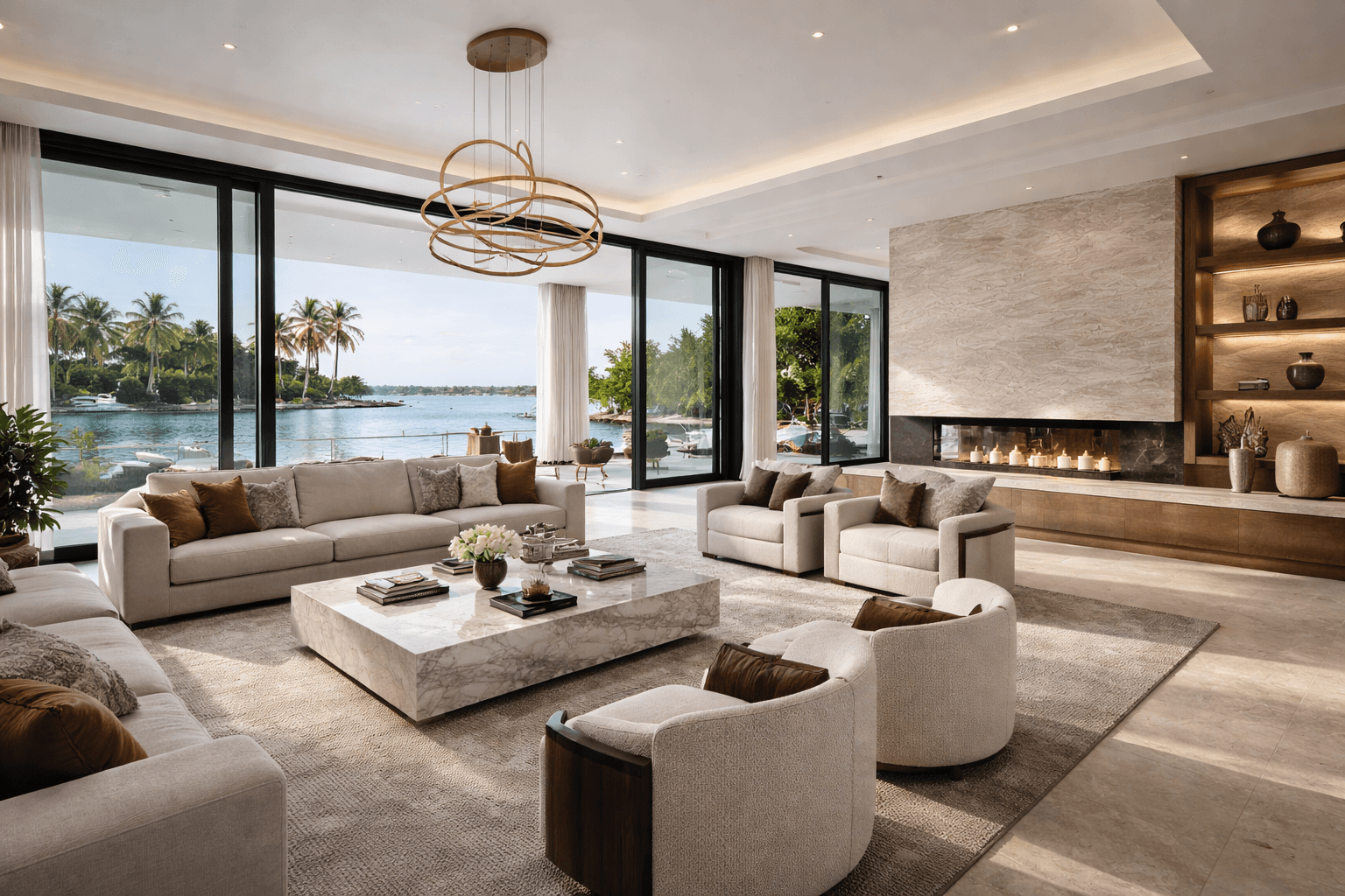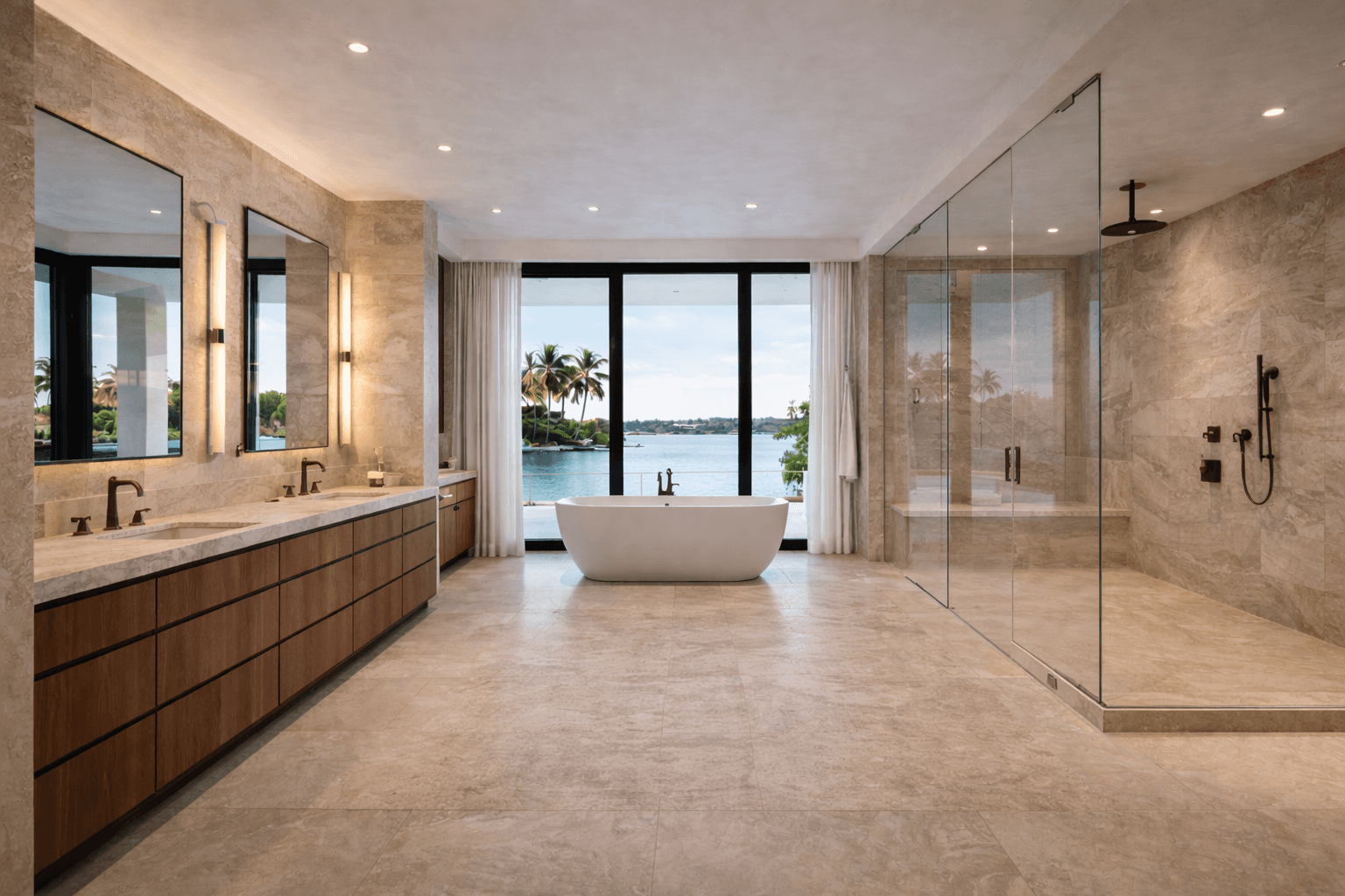 The interior layout is organized around an open plan core with clear structural spans, allowing uninterrupted views and flexible programming. High performance sliding glass wall systems connect primary living spaces to exterior terraces, while concealed HVAC linear diffusers, smart lighting controls, and acoustic treatments are integrated to maintain a minimalist aesthetic. Materials include large format stone flooring, custom millwork, and slab stone applications, all coordinated to align with thermal performance, moisture control, and long term durability in a coastal environment.