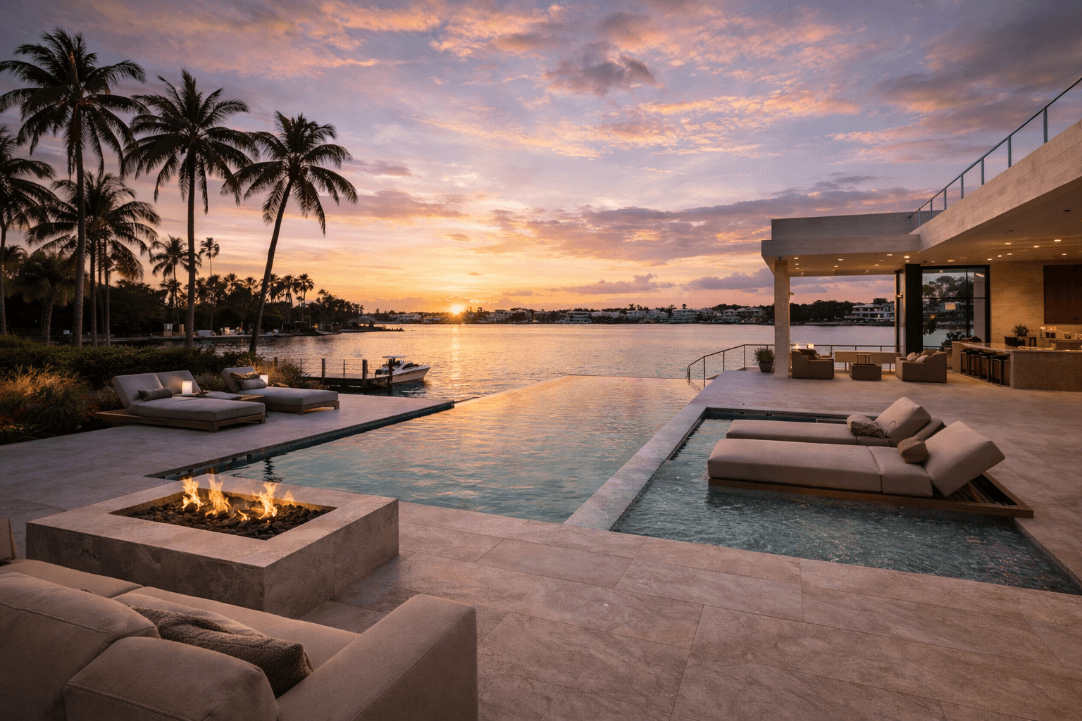 This waterfront Key Biscayne modern residence is conceived as a clean, horizontally oriented architectural volume that maximizes water frontage, sightlines, and indoor outdoor flow. The structure is designed with reinforced concrete construction, deep cantilevered overhangs, and floor to ceiling impact rated glazing to meet coastal wind load and flood zone requirements. The home is elevated and engineered for waterfront conditions, integrating a private dock, seawall interface, and infinity edge pool system that visually merges the architecture with the bay while maintaining structural and hydraulic separation.